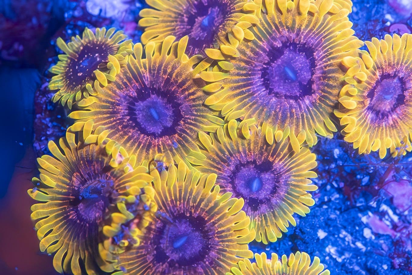 A bold zoanthid from Jason Fox with intense yellows and a unique purple face. This frag includes 2+ healthy polyps.